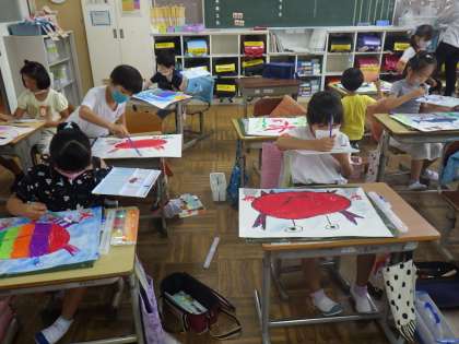 2年生の図工では、「海とさかなとわたしたち」と題して、「虹色のゼリーみたいなクラゲ」など見たこともない不思議な海の生き物を想像してかいています。