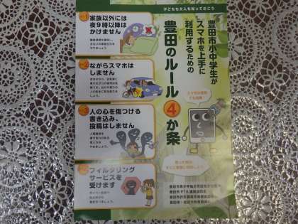 本日、市青少年健全育成推進協議会(青推協)地区代表さんと本校PTA役員が来校され、豊田市の各団体で作成した「豊田のルール4か条」ちらしの配付の依頼がありました。