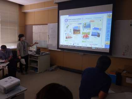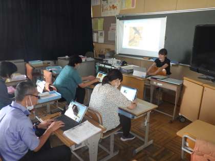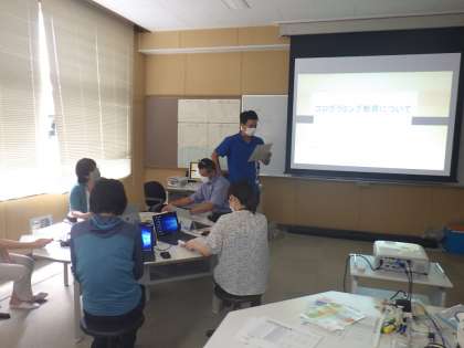子どもたちが帰った午後、担当の先生が講師となって「プログラミング・ICT研修」「外国語教育研修」を行いました。