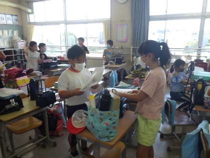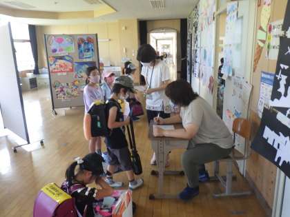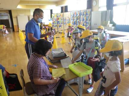 校舎に入ってすぐに健康チェックです。夏休み中しっかり検温している子が多く、感心しました。「元気だった?」「うん。元気」と先生や友達とあいさつしました。