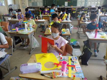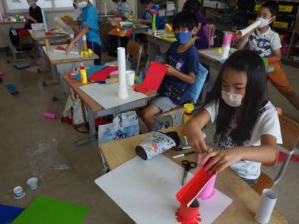 4年生の図工では、「コロコロガーレ」という題でビー玉を転がす立体模型を製作中です。