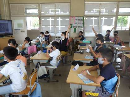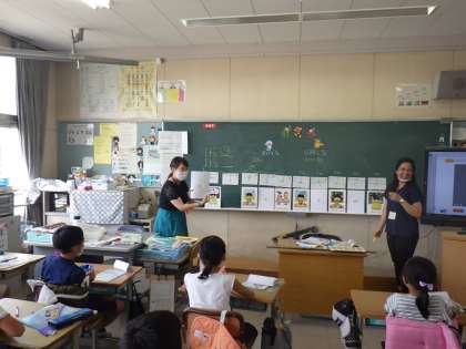 4年生の外国語活動では、何時に起きた?昼ごはんはいつ?おやつはいつ?お風呂はいつ?などのカードを見て、時間を答えるアクティビティをALTとしました。