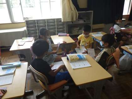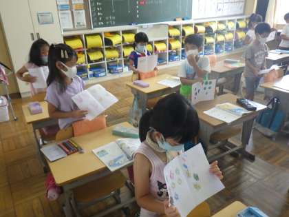 1年生の算数では、たし算、ひき算の学習のまとめとして、たし算やひき算をつかった絵本をつくっています。