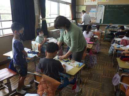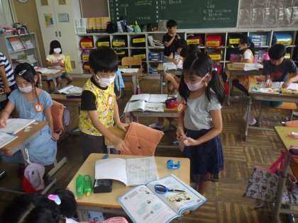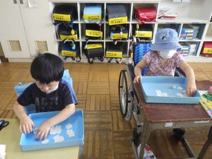2年生の算数で、線路のパーツを組み合わせて「ぐるっと回るせんろ」づくりに挑戦しました。