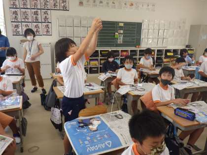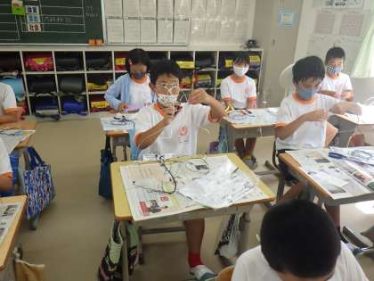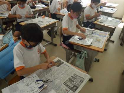 5年生の図工では、「たちあがれワイヤーアート」と題して、針金の特徴を生かして思いついた形を立体に表しています。立たせるのに一苦労しているようです。