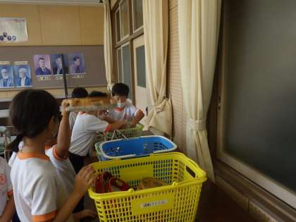 2年生の音楽では、打楽器をつかって三拍子のリズム打ちをしました。