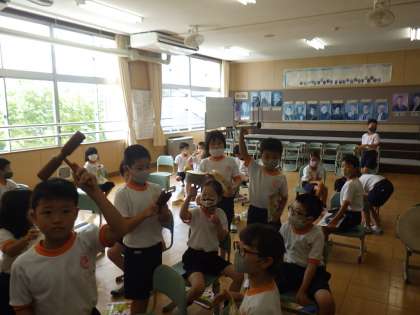 打楽器を持つと勝手に鳴らし始めましたが、教師が伴奏を始めると見事に三拍子のリズムを心地よく刻み始めました。