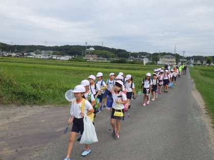 たわわに実る稲の横を通る子どもたちがすごく絵になっています。