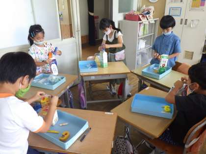 でも中には、「先生、中にキャップを入れる前に閉じちゃった」といって持ってくる子がいたので、ホチキスの針をとってあげました。