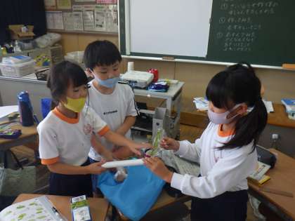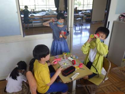 2年生は、先日学んだものづくり教育プログラムで楽器作りを契機として、生活科の学習で1年生におもちゃ作りを教えることにしました。