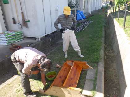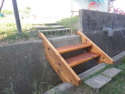 畑にあがる木の階段がいたんでいましたので、地域学校協働本部からの依頼で野菜名人さんに階段を作っていただきました。オーダーメイドでしたが、大工さんの仕事なので、短期間で丈夫な階段です。本当にありがとうございました。