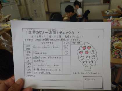 「正しいはしの持ち方で食べる」「三角食べをする」「お皿を持ったり、手を添えて食べる」などをチェックカードに自己評価します。