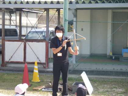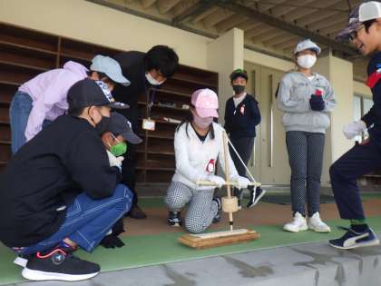 郷土資料館の講師の先生に火おこしの説明をしてもらってさあ体験です。