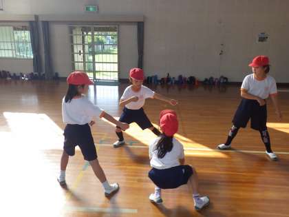 その後は、縦割りの班に分かれて4年生の子が3年生の子に「ソーラン、ソーラン」というさびの部分を教えました。