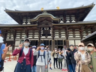柱の穴はくぐれませんでしたが、すいているのでいつもは撮影できない大仏殿前で集合写真が撮れました。