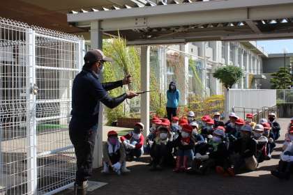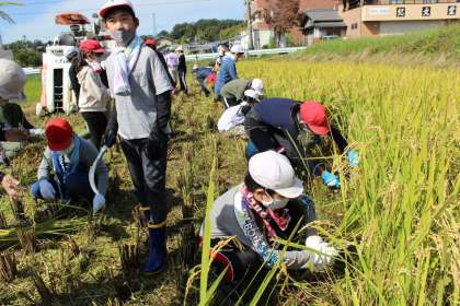 爽やかに晴れ渡った空の下、5年生が稲刈りを行いました。まずはっぴー農産の方から鎌を使った稲の刈り方を学び、田んぼへ入りました。コンバインでの稲刈りを見学し、残った稲を5年生の子どもたちは、手際よく鎌を使って稲を刈りました。刈った稲は、稲穂をそろえてはっぴー農産の方に渡しました。コンバインから出てきたもみを見て、子どもたちは大きな歓声をあげました。
