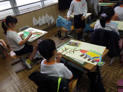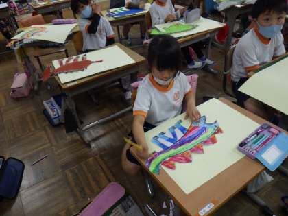 先週は、恐竜を切り取るところをお伝えしましたが、今週は切り取った恐竜を画用紙に貼り付けて、風景を書き加えていました。