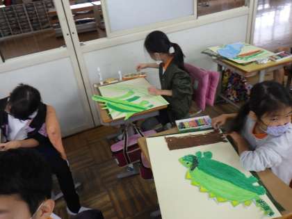 2年生の読書感想画では、「もしもきょうりゅうとくらしたら」というお話をもとに作成しています。