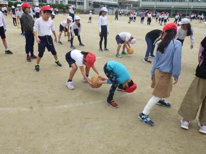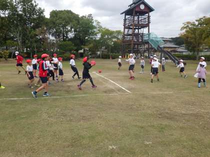 それぞれのフレンド班に分かれて運動場いっぱいに広がって遊び、子どもたちのはしゃぐ声が秋の空に吸い込まれていきます。