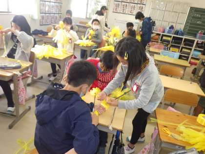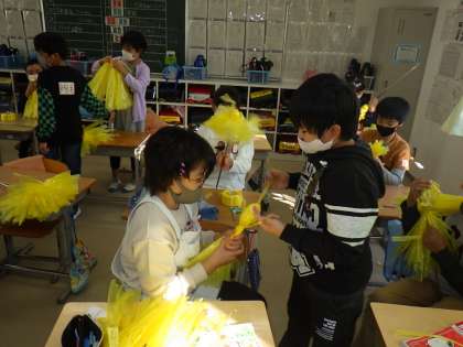 5年生は、体育フェスタで使用するトーチ棒に黄色のタフロープつけていました。