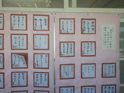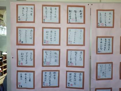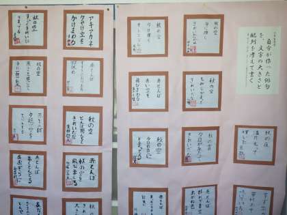 6年生の書写では、自分が作った俳句を文字の大きさと配列を考えて書きました。