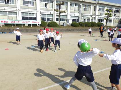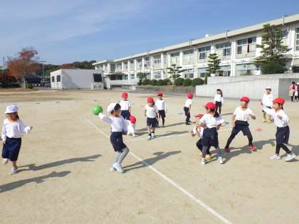 外野の子が内野の子に邪魔をされないように遠くにボールを投げるゲームのようでした。