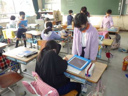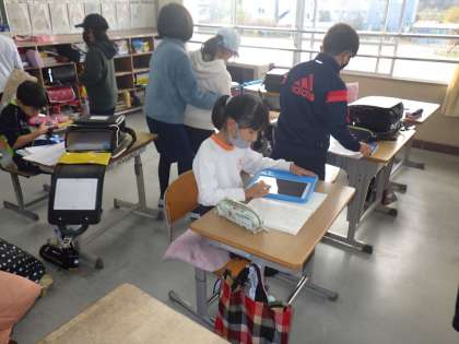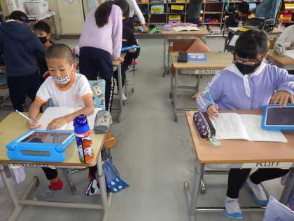 試験的にではありますが、3年で担任の先生がタブレットに明日の予定を配信して、登校した子どもたちはそれを連絡帳に書き写していました。