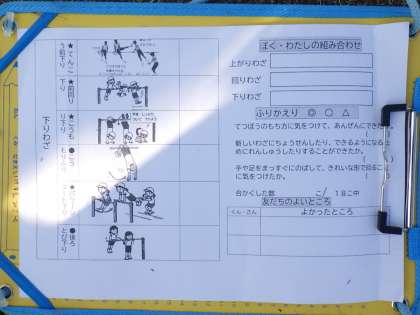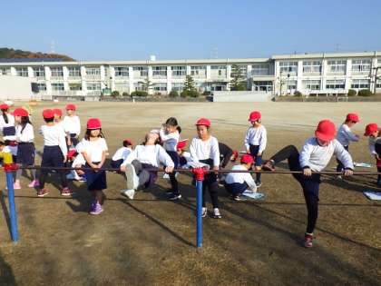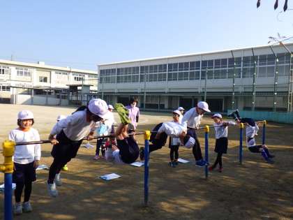 体育の授業が終わったあとのせんだんタイムには、さっそく2年生の子たちが鉄棒で練習をしていました。うまくなるといいね!