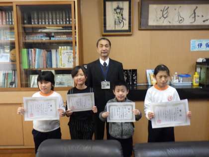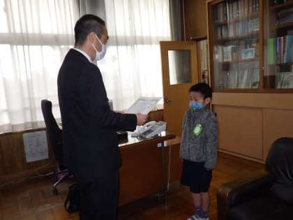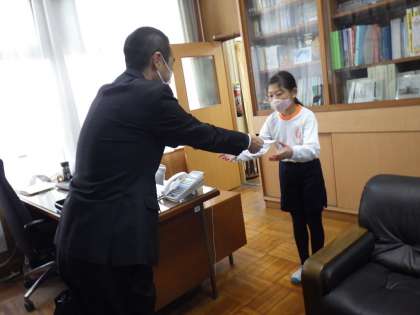 校長室で「読書感想文」と「図書で調べるコンクール」の入賞者の表彰伝達をしました。
