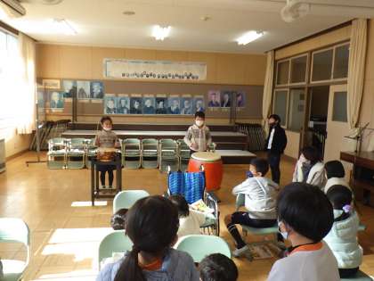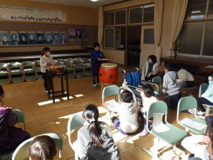 2年生の音楽では、繰り返しのリズムを使って和太鼓をたたき、おまつりの音楽を作っています。