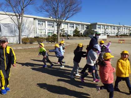 1年生の子に「何しているの?」と聞いてみたところ、「先生とおにごっこ」と教えてくれました。