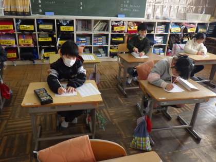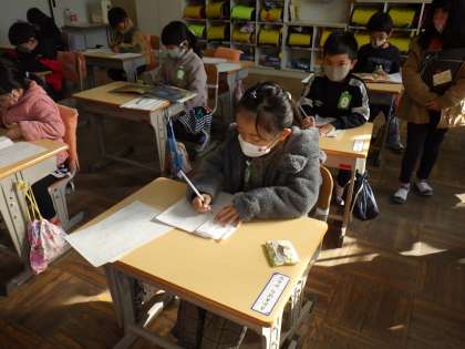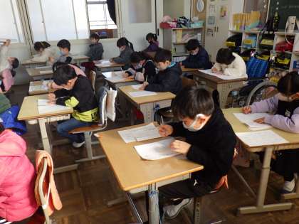 1・2年生は、課題の文字をえんぴつで用紙のマス目に入れて書きます。