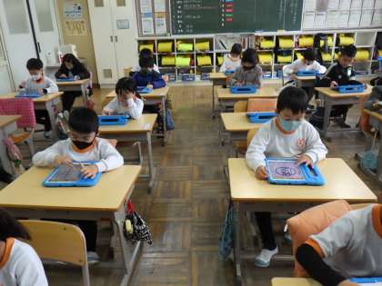 1年生は、タブレットでプログラミングソフトなどに取り組んでいました。静かにできてすばらしい!