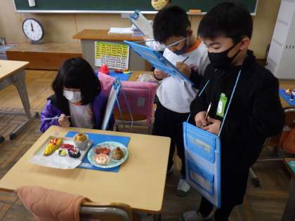 1年生は、図工で作った「ごちそうパーティ」の作品の鑑賞会をしました。