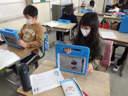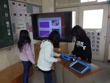 タブレットでまとめたノートを使って発表します。原稿を書き、読む練習をしていました。