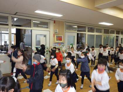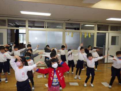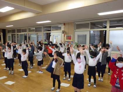 「6年生を送る会」に向けて、1年生は「よかった音頭」の練習をしています。
