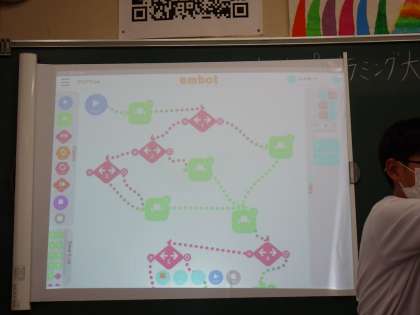 6年生の総合的な学習では、embot(エムボット)でプラグラミングを学んでいます。embotは購入すると結構高いのですが、NTTの「みらプロ」事業に応募し、無償で提供していただきました。