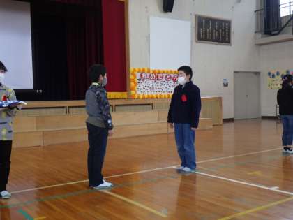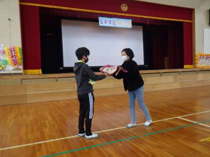 会の最後は、6年生から5年生へ校旗やJRC旗、委員会などの引継ぎを力強いメッセージとともに行いました。