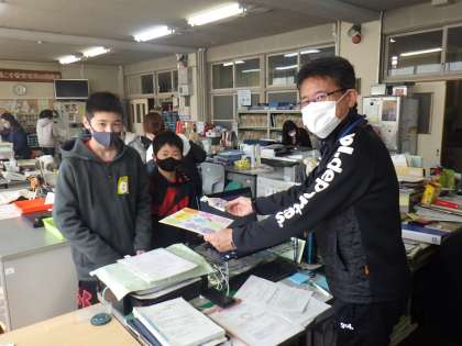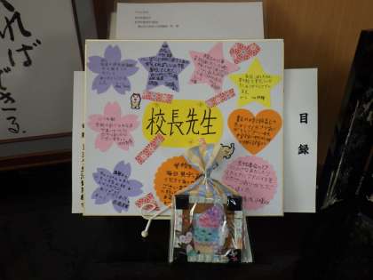 6年生は、お世話になった先生方に寄せ書きした色紙と手作りコースターのプレゼントをしました。