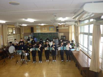 まずは、合奏です。5年生の学芸会で演奏した曲で1組「アラジン」2組「ハイホー」を披露しました。