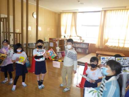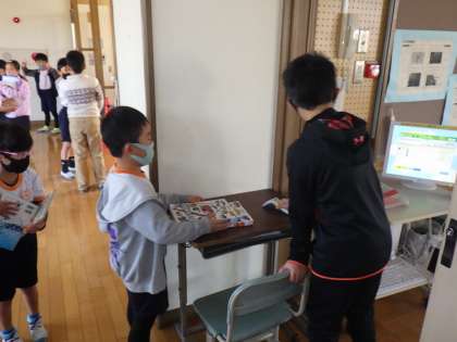今年から設置された低学年図書館では、毎朝1・2年生の子たちが本を借りに来ています。