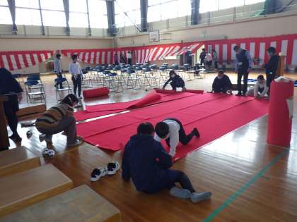 5年生は、体育館の会場準備と6年生教室の飾りつけをしました。