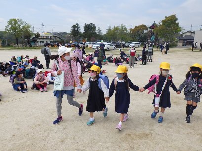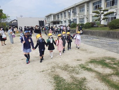 一斉下校では、通学団の副班長が1年生を迎えにきてくれました。途中ではぐれないように、手をつないで通学班まで移動しました。みんな、とてもすてきなニコニコ笑顔でした。