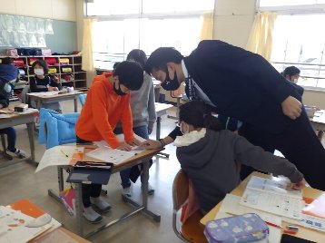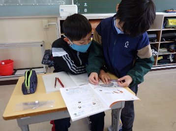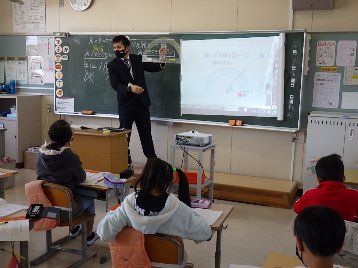 算数の授業で、4年生は初めて分度器を使いました。分度器の使い方を担任の先生から教えてもらい、さっそく分度器を使って角度を測りました。先生が「じゃあ、友達と確認して」というと、「そうそう、そこに合わせて」「最初は、この線に合わせるんだよ」と言いながら、使い方を確認していました。