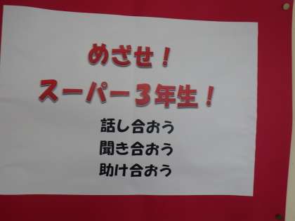 3年生では「めざせ!スーパー3年生!」の合言葉のもと、お互いの話しを聞きあう姿勢を大切に指導を進めています。