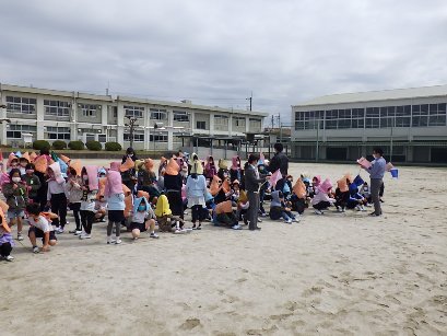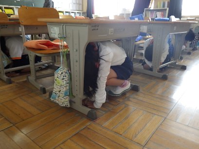 2時間目の途中で、避難訓練を行いました。各学級で、避難時の大切な約束「おはしも」(押さない、走らない、しゃべらない、戻らない)を確認してから行いました。訓練放送がかかると、全校児童は黙って机の下に潜り込み、避難指示の放送で、整列して無言で避難をしました。