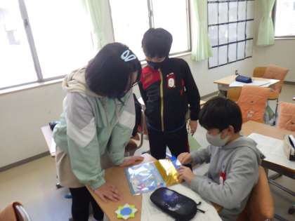 先生の前で司会の練習をしたり、プレゼントを作ったりしています。