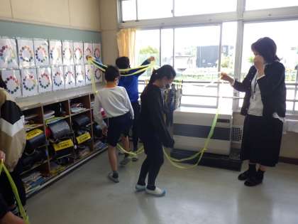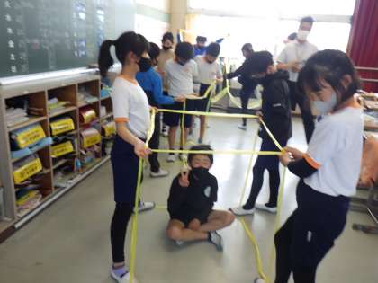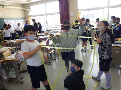 今日は、1立方メートルを体感するためにタフロープで1メートルを囲み空間を作りました。