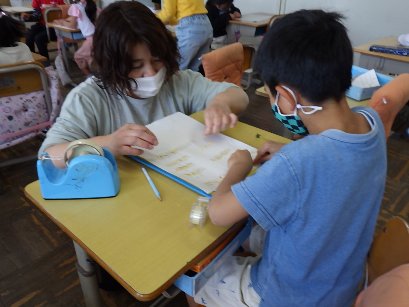 国語科「タンポポ」の学習では、タンポポの花のように見えるものは、小さな黄色い花の集まりであることが、説明文中に書かれています。子どもたちは校庭のタンポポを採ってきて、タンポポから1つ1つ花を採取し、紙の上に並べて、いくつの花が集まってできているのかを、数えました。「先生、見て見て!140個もあった!」と、嬉しそうに報告してくれました。