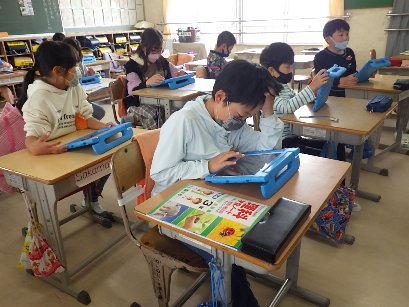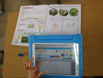 3年生は理科で、「生きもののすがたは、色、形、大きさなどのちがいがあるのだろうか」ということを考えました。NHKの動画にでてくる様々な生きものを見て子どもたちは「(色、形、大きさは)全然ちがう」と答えました。動画中に出てきたホトケノザが、理科ノートにも載っていることを見つけた子どもたちは、タブレットを使ってホトケノザについて調べることにしました。子どもたちは慣れた手つきで、タブレットを使って検索をして、ホトケノザの色や形、大きさや生えている場所などを調べました。